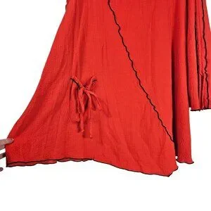 Vibrant orangey red tunic with black trim and an asymmetrical hem. The relaxed fit and lightweight material ensure all-day comfort.