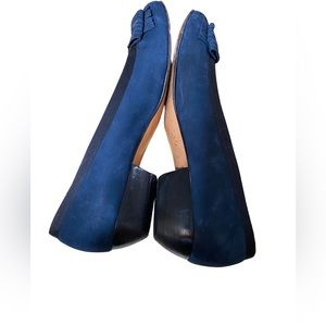 Salvatore Ferragamo vara ribboned flats in navy blue with black upper ribbon trim.