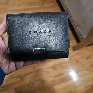 Elegant black leather wallet by Coach. Features a sleek design with a silver clasp.
