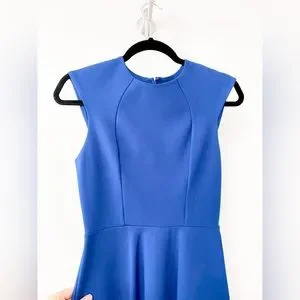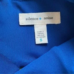 Silence + Noise mini dress. Fit and flare silhouette. Blue in color. Crew neck with princess seam bodice. Open back with fun geometric cut out for a strappy back. Nice thick