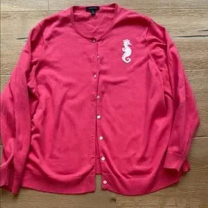 Pink Land’s End knit button down cardigan with seahorse detail. Soft fabric. Perfect for everyday comfort.