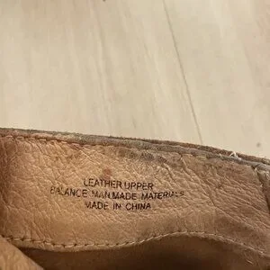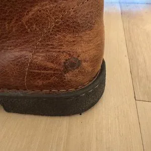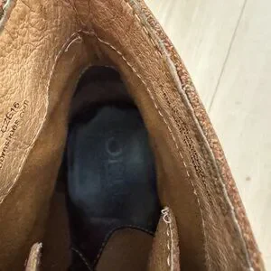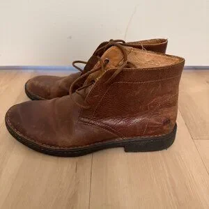 Men's Born leather chukka boots in rich brown and handsome natural worn in patina. Cushioned insole for great all day comfort. General wear and scuffs consitent with leather boots which give a beautiful patina. Small dark spot on outer heel (see photos). Lots of life left in them.
