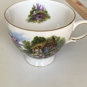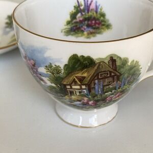 Vintage Royal Vale Teacup & Saucer Cottage Scene & Gardens - Bone China England