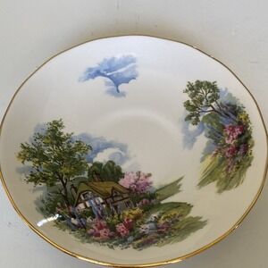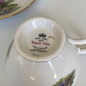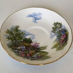 This Vintage Royal Vale Teacup & Saucer set in Bone China features a charming Ridgeway Cottage scene with gardens, perfect for any occasion. The multicolor painted design adds a touch of nostalgia to your tea-drinking experience. Made in England in the 1950s, this country-style teacup and saucer set is a collectible piece that showcases the floral theme and decorated features of Royal Vale's craftsmanship. Ideal for both collectors and those looking to add a touch of vintage charm to their kitchen or dining area.