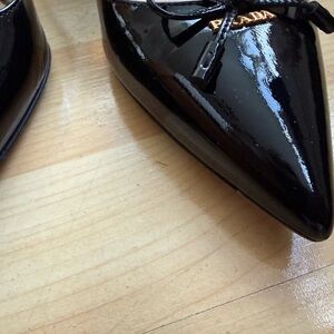 Sleek black patent leather heels with bow detail. Classic and stylish design by Prada. With box, dust bag, and extra pair of Prada heel lifts.