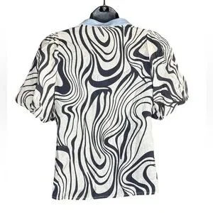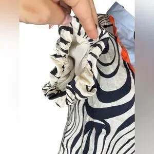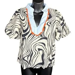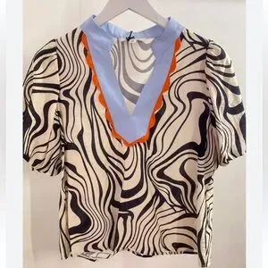 THML women’s geometric Juliet sleeves black cream v neck baby blue and orange trim size XS
