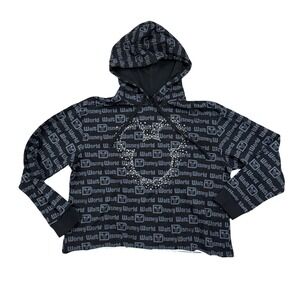 Walt Disney World all-over print cropped hoodie features a bold repeating logo pattern in grey on a black base. A large Mickey Mouse head silhouette on the chest is composed of sparkling silver bling and star-shaped studs for a touch of Disney magic. This long-sleeve pullover includes a drawstring hood and a trendy raw-edge hem for a modern, relaxed fit. Perfect for park days or casual Disney-inspired streetwear. Style #JT24344.
