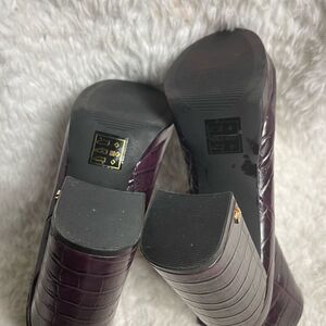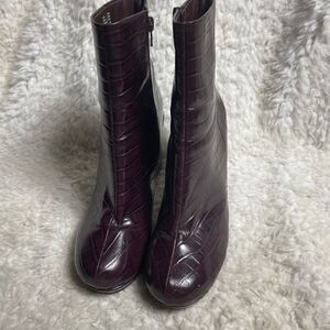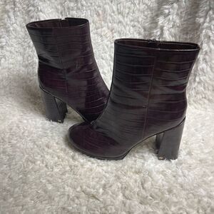 Rachel Zoe Maya Deep Mahogany Croc-Embossed Faux leather Platform Boots gold tone accents side zipper block heels.Pre owned in good used condition the right boot has a scratch on the side of the heel not noticeable when wearing.