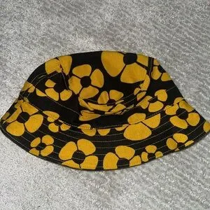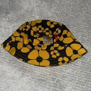 Stylish Carhartt bucket hat with vibrant yellow floral pattern on black. Ideal for a chic look.