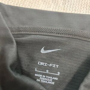 This shirt is 100% polyester. It is a Dryfit shirt. It is black with the gold logo. It also has the Nike logo on the sleeve