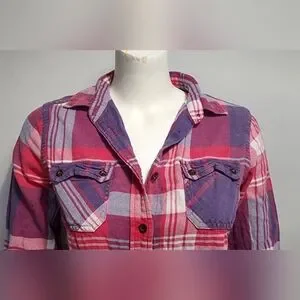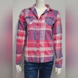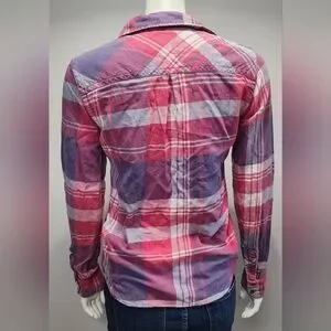 American Eagle Womens Favorite Fit Pink Purple Flannel Plaid Button Up Small S