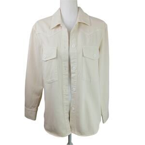 Heavyweight, structured twill denim, long sleeve, natural ivory collared buttondown shirt jacket featuring oversized fit, western yoke details, and oversized military patch pockets at chest. This classic throw-on-and-go style is perfect for transitional temps.