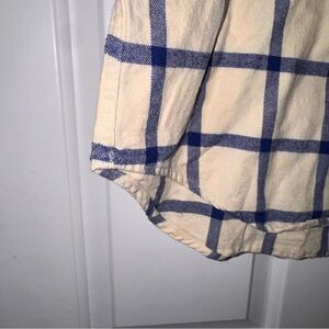 Featuring a cream and blue plaid design, this button-down shirt is made from 100% cotton, ensuring comfort and breathability. Its versatile and timeless style makes it perfect for layering in the fall and winter or wearing on its own for casual outings, work, or lounging. Great for layering! Extra buttons included, materials tag cut, but this is 100% cotton with no stretch. Excellent condition- measurements in pictures.