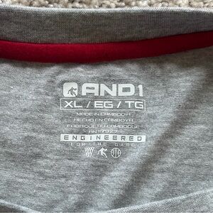 The product is an AND1 Men's Vintage Basketball Baller Graphic T-Shirt in size XL and gray color. Made from cotton material, this short sleeve tee features a crew neck and a regular fit. The shirt is machine washable and adorned with a vintage logo graphic, representing the brand's iconic style. Perfect for the summer and spring seasons, this T-shirt is a stylish choice for men looking to add a touch of retro flair to their wardrobe.