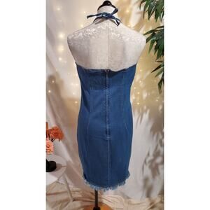 Vtg 90s Y2K Xhilaration Stretch Denim Halter Raw Hem Fringe Dress Womens Size M Blue