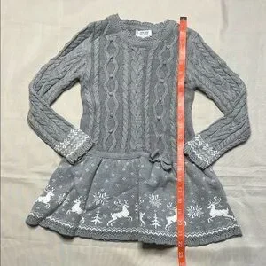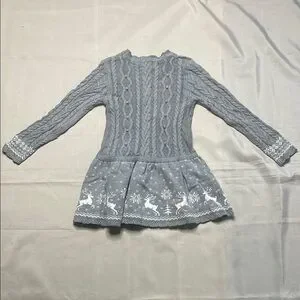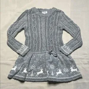 Keep your child warm and stylish with this cozy gray knit dress. Featuring a charming winter pattern, it's perfect for chilly days. Has a little bit on discoloration on the front and right arm sleeve.