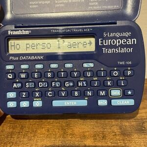 Great used condition pocket translator. Just replaced battery with brand new for its next owner. Works great. Translates English, Spanish, French, Dutch, and Italian. Great for travelling, does not require wifi.