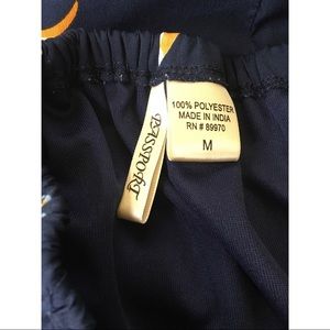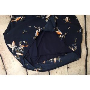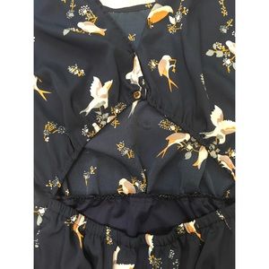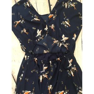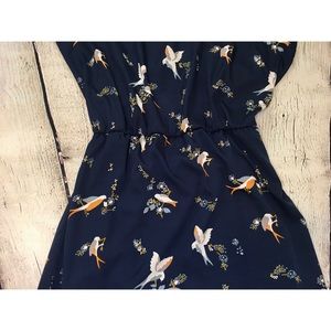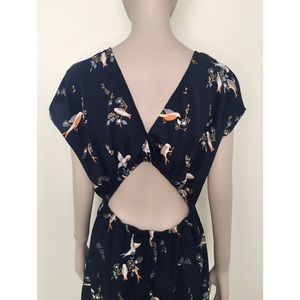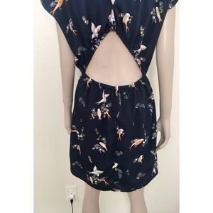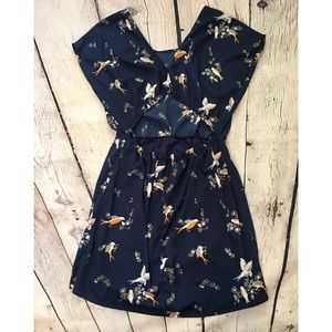 Passport navy dress with sparrow/dove design. Short sleeves. Elastic banding at back and waist for extra stretch. Back cut out detail. Back button closure. Slight high low hem. Dress is lined.
