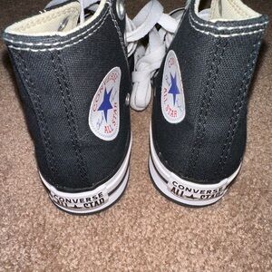 Classic Converse high-tops for kids. Black canvas with white accents. Comfortable and stylish.