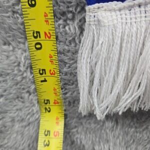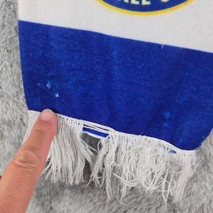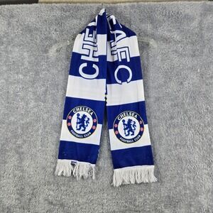 Chelsea FC soccer scarf in a classic blue and white striped design. This fan accessory features the iconic Chelsea Football Club crest prominently displayed at both ends, along with "CHELSEA FC" block lettering. Finished with traditional white fringe, it's a perfect piece for match days at Stamford Bridge or for any Blues supporter. Note: There is some minor fraying/damage to the fringe and small spots of wear on the fabric as shown in photos.