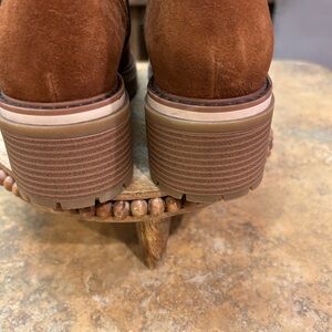 Stylish brown lace-up boots with distinctive green laces. Features a side buckle and sturdy heel. Water-Repellent suede. Really nice boots. My friend purchased these larger to wear with socks and she said they just don’t fit her well. Size 9.5.