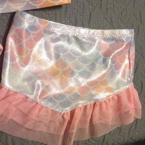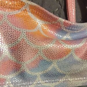 Adorable pink and multicolor mermaid bikini set. Features a ruffled top and skirt with a mermaid scale pattern.