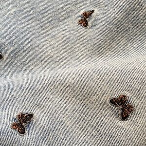Chic light blue jeans with butterfly accents. Frayed ankle design for a trendy look.