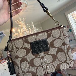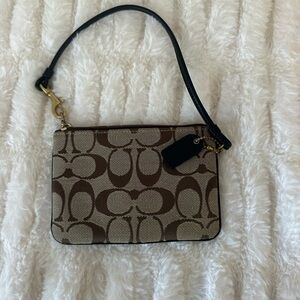 Stylish wristlet with iconic Coach pattern. Features a sleek black strap and gold accents.