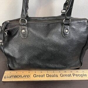 Roots Canada satchel handbag crafted from premium black pebbled leather with a structured yet sott silhouette. This Made in Canada piece features dual rolled top handles, contrast white stitching, and silver-tone hardware including protective base feet. The exterior includes a convenient vertical zip pocket on the back, while the top zipper opens to a spacious tabric-lined interior with multiple organizational pockets. The interior lining shows some signs of use and ink marks, and there is minor scuffing on the bottom corners consistent with gentle wear.