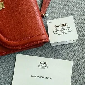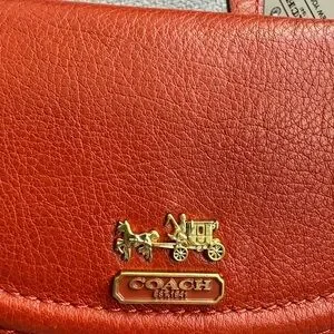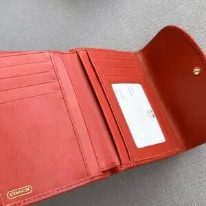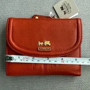 Coach Madison Flap Leather Wallet with Gold Accents .Elegant leather wallet in a vibrant scarlet hue. Features a gold-tone Coach logo.