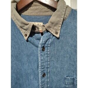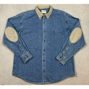 The Cabela's Men's XL Tall Denim Button-Up Shirt is a vintage-inspired piece with a relaxed fit, perfect for a casual yet stylish look. Made of heavyweight cotton denim, this shirt features a solid blue color with button-up closure, collared neckline, and long sleeves. The elbow patches add a touch of grunge to the overall design, making it a standout piece for the hunting lodge or outdoor setting. With its classic style and durable fabric, this shirt is a versatile and timeless addition to any wardrobe.
