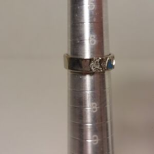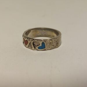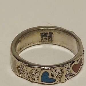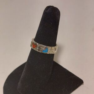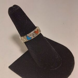 Vintage Silver Ring Crushed Turquoise & Coral Hearts Ring Size 7 Signed