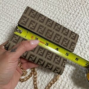Elegant Fendi wallet featuring signature monogram. Includes a chic gold chain strap. It’s in good used condition. Only call out is the rubbing on the inside tab closure. No rips or stains. Edges are in good condition. Proof of authenticity included. Please look at pics before purchasing. Ships quickly.