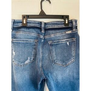 KanCan high-rise straight leg jeans in a medium wash featuring heavy distressing and a raw, frayed hem. These denim pants offer a classic five-pocket styling with a zip fly and button closure, accented by whiskering and faded details for a lived-in look. The stretch denim blend ensures a comfortable fit while maintaining a structured silhouette.