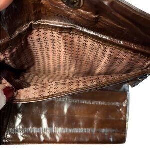 Beautiful vintage genuine eel skin wallet in rich chocolate brown. Eel skin is known for its ultra-soft feel, lightweight durability, and natural glossy striped texture.