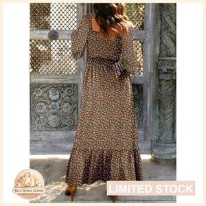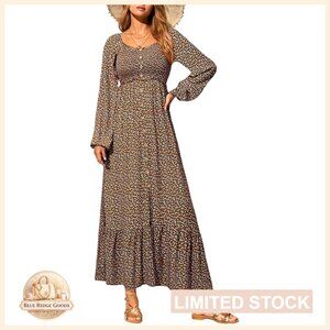 Boho Floral Maxi Dress Smocked Empire Waist Square Neck Long Sleeve Button Beach