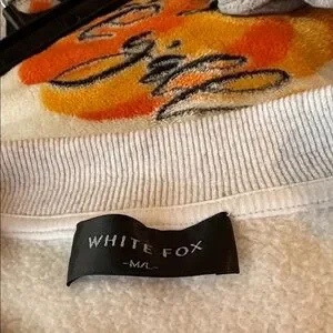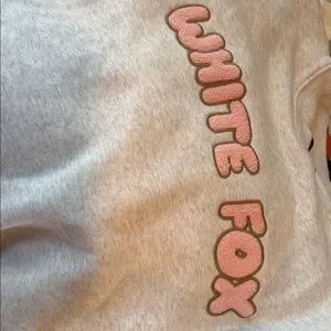 Cozy gray sweatshirt with 'White Fox' in pink lettering. I don’t think my daughter ever wore it.