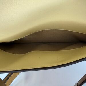Hardware: Features a front flap with a signature belted strap and a gold-tone clasp buckle closure.