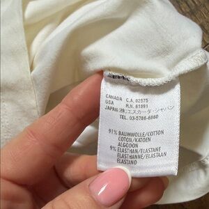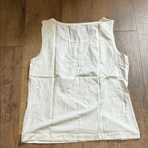 White tank top featuring a striking graphic design. Red and black accents add bold style.