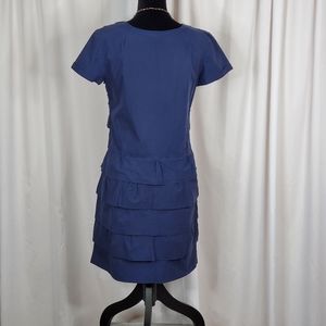 J Crew dress in navy blue, size 2. Short sleeve button up dress with horizontal ruffles down the whole front of the dress and on the bottom half in the back. Cotton fabric, there's no stretch so please keep in mind. All measurements are taken flat.