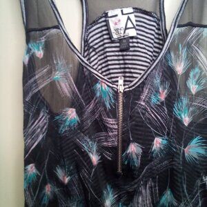 Living Doll Blouse M Sheer Sleeveless Zipper Black White Print