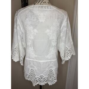 The NWOT Democracy Women's Size XS Crochet Cotton Peplum Top is a stylish and versatile piece perfect for various occasions such as weddings, parties, formal events, and business meetings. This solid white top features a 3/4 bell sleeve with embroidered accents, giving it a unique and dressy look. Made from lightweight crochet cotton, this tunic-style blouse offers a relaxed fit and is machine washable for easy care. Perfect for the winter, fall, and spring seasons, this top embodies a hippie, bohemian, peasant, and dressy theme, making it a standout addition to any wardrobe.