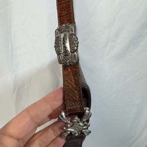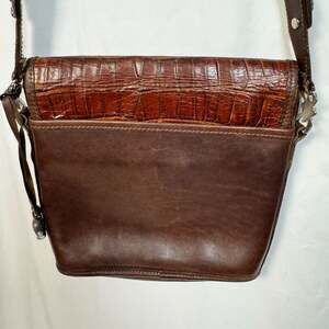 Vintage Brighton Messenger Crossbody Bag, Brown Leather with Croc Embossing, 80s/90s Early Release. Made in USA. This rare collector's piece features the iconic Brighton silver-tone hardware, including a filigree heart centerpiece and ornate strap details.
