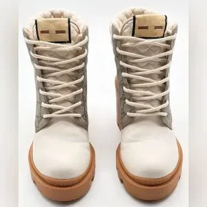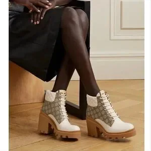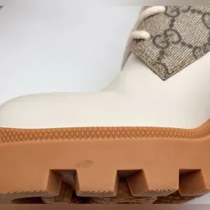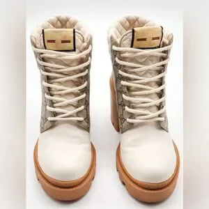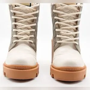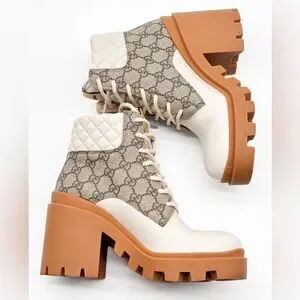 Stylish Gucci heeled boots. Cream leather with tan accents. Signature pattern design. Perfect for any occasion. beautiful, like new. I little to tall for me. 3.5 inch heel.