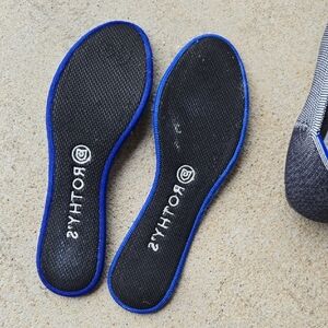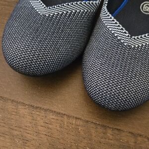 Chic and sustainable flats by Rothy's. Features a stylish black design with blue accents. Ideal for versatile wear.