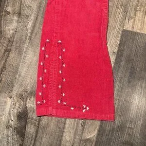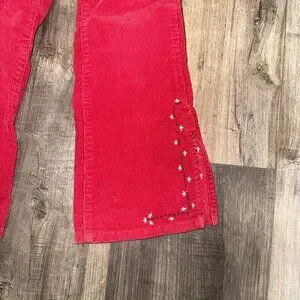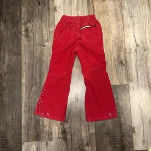 The product is a pair of vintage Y2K Tommy Hilfiger girls' red corduroy flare leg pants in size 4T. They feature intricate embroidery and a pull-on closure, making them a stylish and comfortable option for young girls. The ankle length and flare leg design add a fun and trendy touch, perfect for adding a pop of color to any outfit. Made from durable corduroy fabric, these pants are sure to become a versatile staple in any girl's wardrobe.