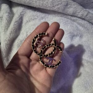 Stylish earrings with black and gold chain design. Iconic logo detail. Adds sophistication to any look.