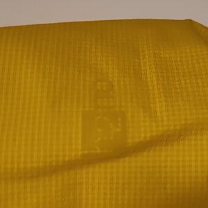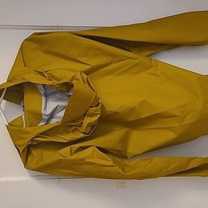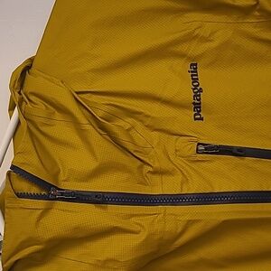 Bright yellow / gold hooded jacket by Patagonia. deep half zip with front zipper pocket and H2no waterproofing. awesome Patagonia coat. subtle staining near waistline. VGUC.