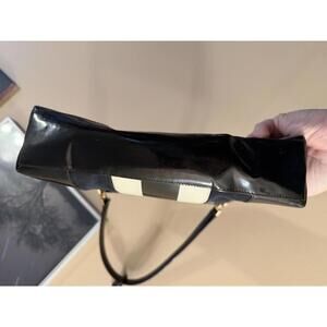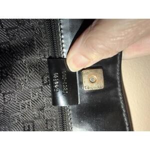 Stylish Gucci shoulder bag featuring black and white vertical stripes on a navy base. Made with a combination of fabric and patent leather accents. Single shoulder strap for comfortable carrying. Compact and sleek design perfect for everyday use or casual outings. See photo 5 for callout on strap that can be fixed by a cobbler. 13x12