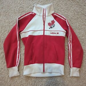 Classic Adidas jacket with bold red and white design. Features high collar and zippered front pockets. Ideal for everyday style.